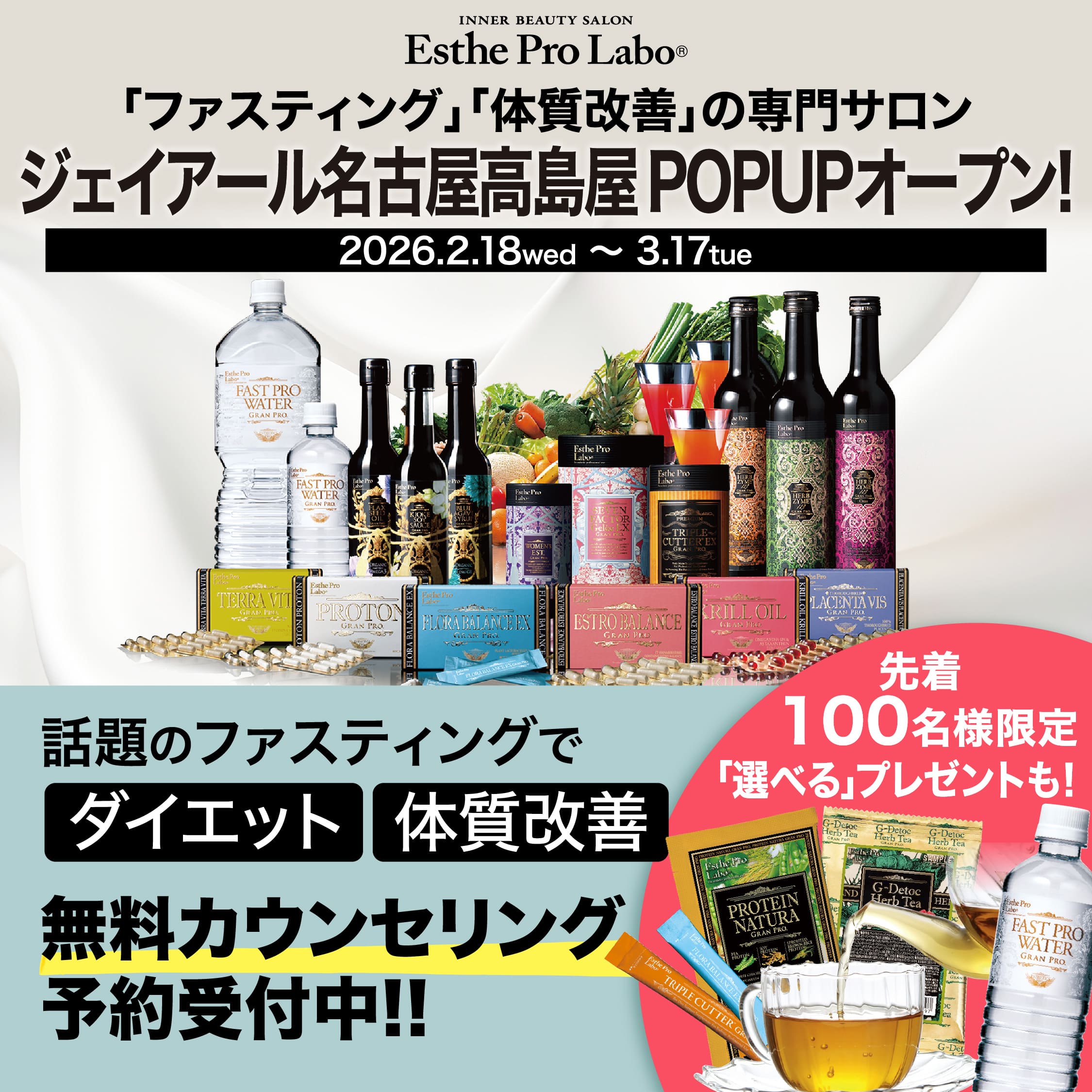 インナービューティサロン エステプロ・ラボは、全国各地で期間限定のポップアップショップを開催しています。ご来場者様限定の特典もご用意しています。近くに店舗が無くてカウンセリングを受けられない方は、ぜひこの機会にお立ち寄りください。